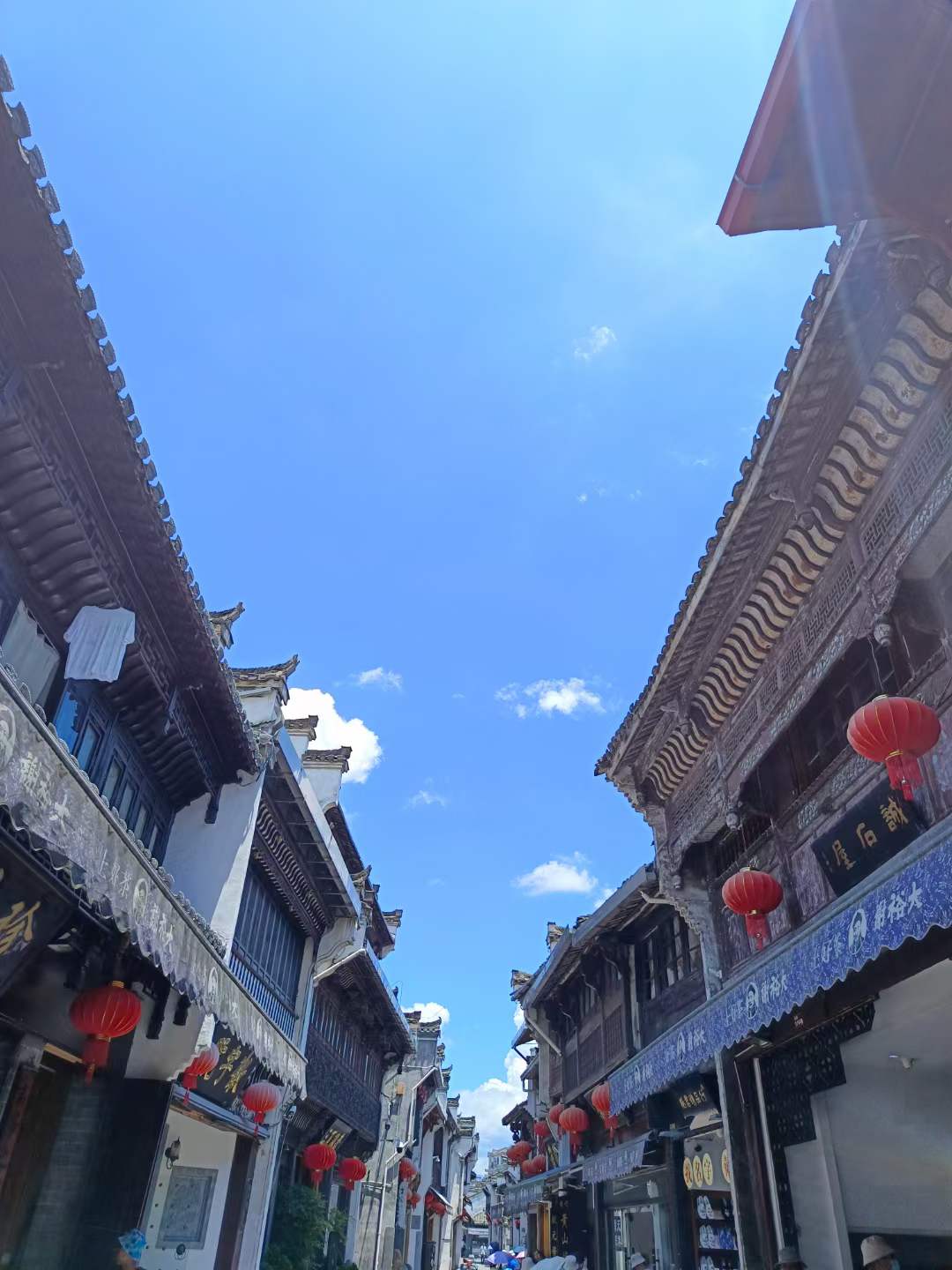 經(jīng)過3個(gè)多小時(shí)的車程,我們首先來到的是屯溪老街。屯溪老街座落在安徽省黃山市屯溪區(qū)中心地段,北面依山,南面傍水,全長1272米,由不同年代建成的300余幢徽派建筑構(gòu)成的整個(gè)街巷,呈魚骨架形分布,西部狹窄、東部較寬。因屯溪老街坐落在橫江、率水和新安江三江匯流之處,所以又被稱為流動(dòng)的"清明上河圖",是中國保存最完整、最具有南宋和明清建筑風(fēng)格的古代街市,也是中國"全國重點(diǎn)文物保護(hù)單位"。
